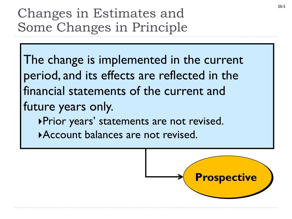 Accounting Changes and Error Corrections. Chapter 20. Accounting Changes. Correction of an Error. Error Corrections and Most Changes in Principle. Retrospective. Revise prior years’ statements (that are presented for comparative purposes) to reflect the impact of the change.