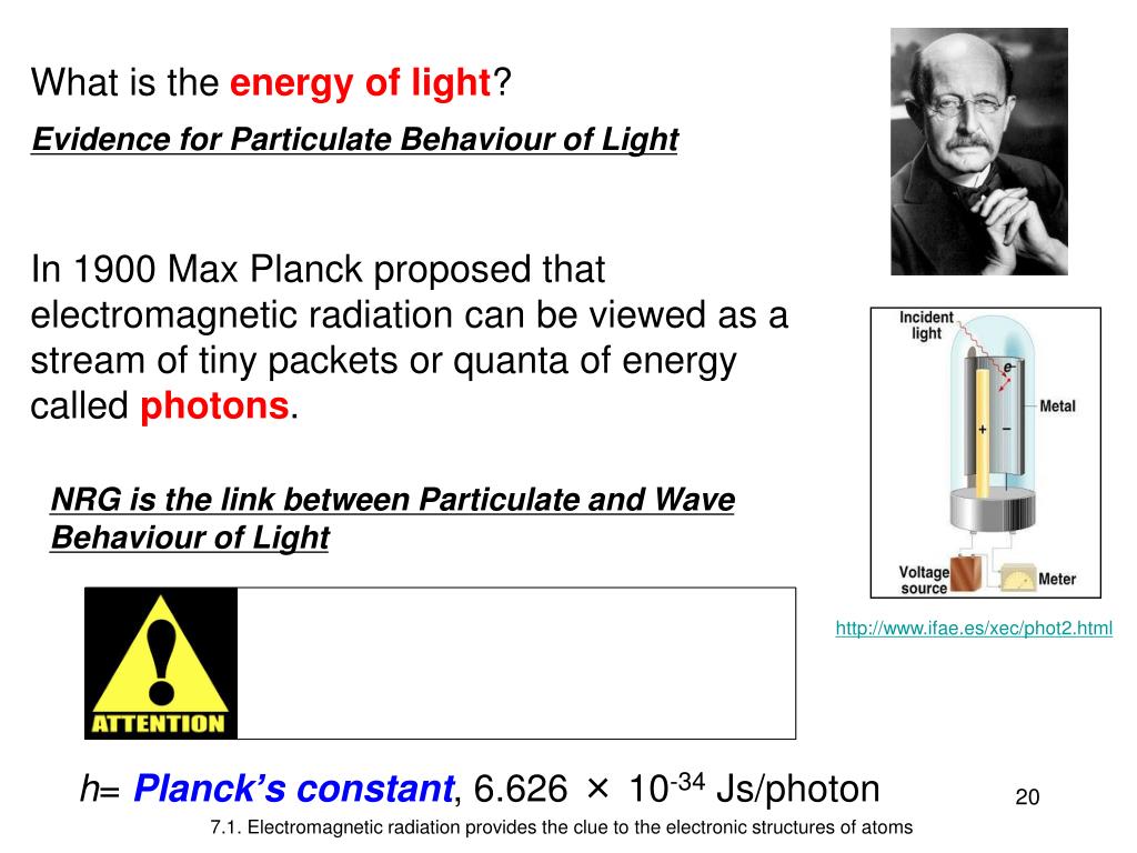 What is the energy of light? In 1900 Max Planck proposed that electromagnetic radiation can be viewed as a stream of tiny packets or quanta of energy called photons. Evidence for Particulate Behaviour of Light NRG is the link between Particulate and Wave Behaviour of Light http://www.ifae.es/xec/phot2.html h= Planck’s constant, 6.626 × 10-34 Js/photon 7.1. Electromagnetic radiation provides the clue to the electronic structures of atoms