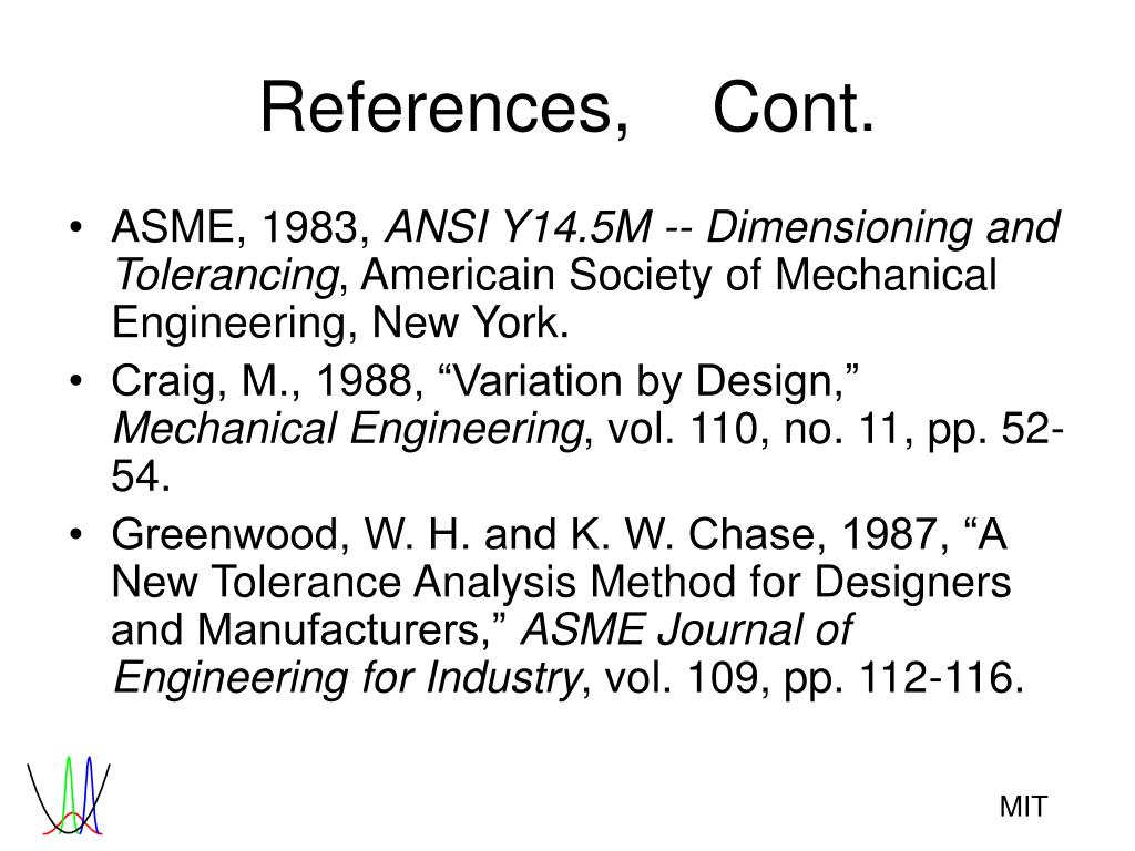 References, Cont. • ASME, 1983, ANSI Y14.5M -- Dimensioning and Tolerancing, Americain Society of Mechanical Engineering, New York. • Craig, M., 1988, “Variation by Design,” Mechanical Engineering, vol. 110, no. 11, pp. 52-54. • Greenwood, W. H. and K. W. Chase, 1987, “A New Tolerance Analysis Method for Designers and Manufacturers,” ASME Journal of Engineering for Industry, vol. 109, pp. 112-116.