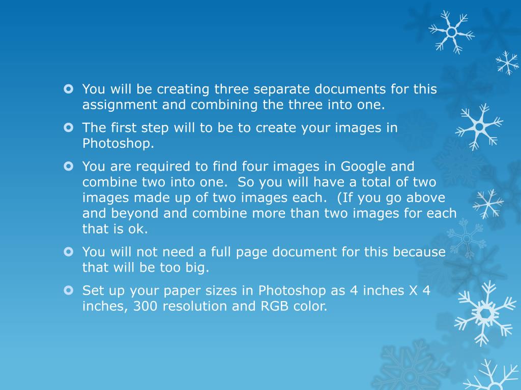 You will be creating three separate documents for this assignment and combining the three into one. • The first step will to be to create your images in Photoshop. • You are required to find four images in Google and combine two into one. So you will have a total of two images made up of two images each. (If you go above and beyond and combine more than two images for each that is ok. • You will not need a full page document for this because that will be too big. • Set up your paper sizes in Photoshop as 4 inches X 4 inches, 300 resolution and RGB color.