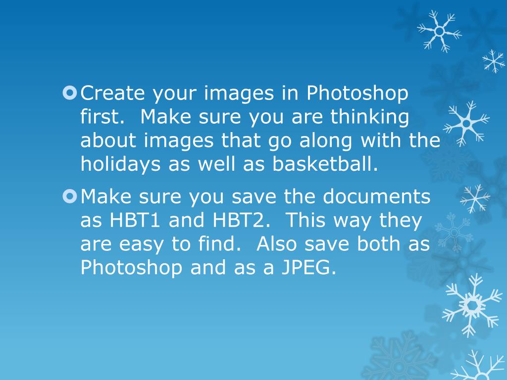 Create your images in Photoshop first. Make sure you are thinking about images that go along with the holidays as well as basketball. • Make sure you save the documents as HBT1 and HBT2. This way they are easy to find. Also save both as Photoshop and as a JPEG.