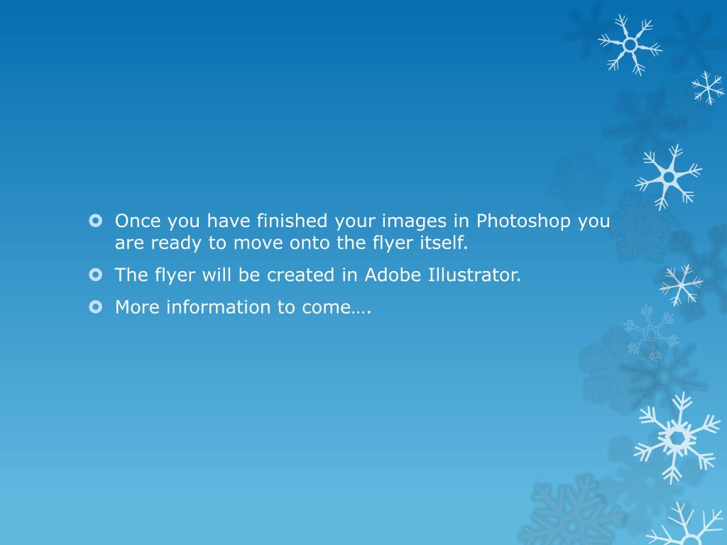 Once you have finished your images in Photoshop you are ready to move onto the flyer itself. • The flyer will be created in Adobe Illustrator. • More information to come….