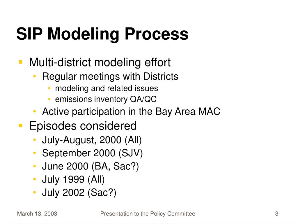 SIP Modeling Process • Multi-district modeling effort • Regular meetings with Districts • modeling and related issues • emissions inventory QA/QC • Active participation in the Bay Area MAC • Episodes considered • July-August, 2000 (All) • September 2000 (SJV) • June 2000 (BA, Sac?) • July 1999 (All) • July 2002 (Sac?) Presentation to the Policy Committee