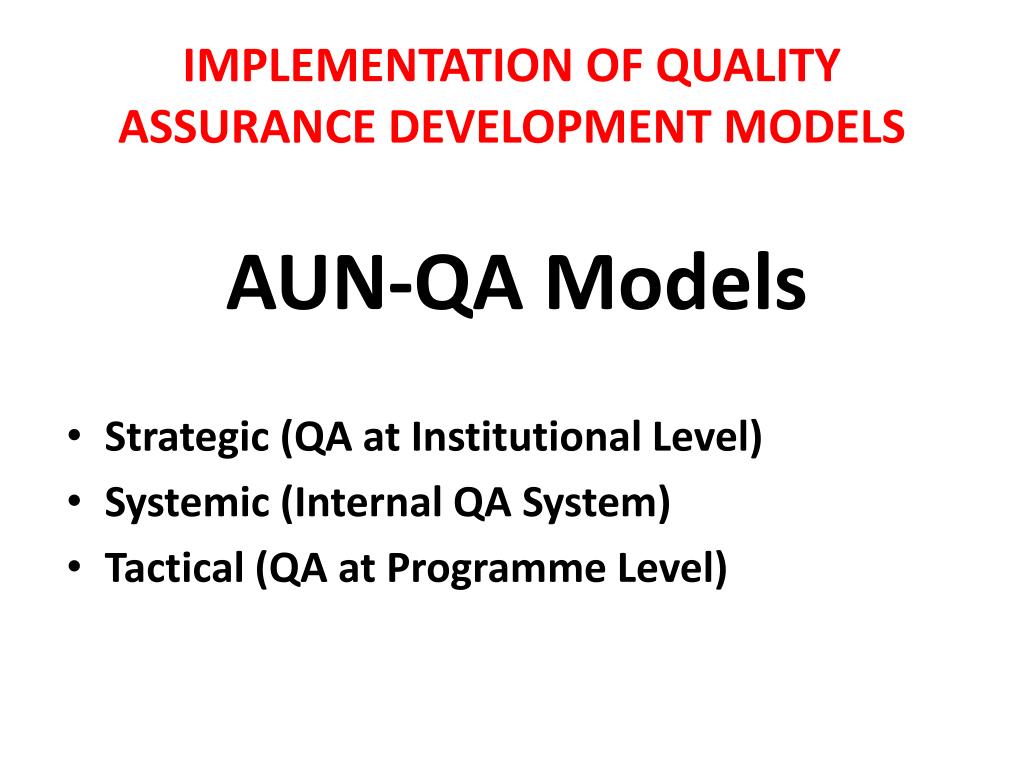 IMPLEMENTATION OF QUALITY ASSURANCE DEVELOPMENT MODELS AUN-QA Models • Strategic (QA at Institutional Level) • Systemic (Internal QA System) • Tactical (QA at Programme Level)