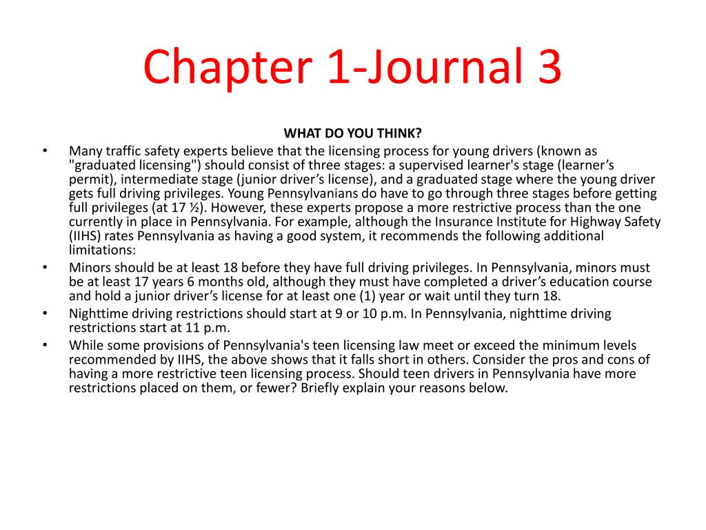 Chapter 1-Journal 3 WHAT DO YOU THINK? • Many traffic safety experts believe that the licensing process for young drivers (known as "graduated licensing") should consist of three stages: a supervised learner's stage (learner’s permit), intermediate stage (junior driver’s license), and a graduated stage where the young driver gets full driving privileges. Young Pennsylvanians do have to go through three stages before getting full privileges (at 17 ½). However, these experts propose a more restrictive process than the one currently in place in Pennsylvania. For example, although the Insurance Institute for Highway Safety (IIHS) rates Pennsylvania as having a good system, it recommends the following additional limitations: • Minors should be at least 18 before they have full driving privileges. In Pennsylvania, minors must be at least 17 years 6 months old, although they must have completed a driver’s education course and hold a junior driver’s license for at least one (1) year or wait until they turn 18. • Nighttime driving restrictions should start at 9 or 10 p.m. In Pennsylvania, nighttime driving restrictions start at 11 p.m. • While some provisions of Pennsylvania's teen licensing law meet or exceed the minimum levels recommended by IIHS, the above shows that it falls short in others. Consider the pros and cons of having a more restrictive teen licensing process. Should teen drivers in Pennsylvania have more restrictions placed on them, or fewer? Briefly explain your reasons below.
