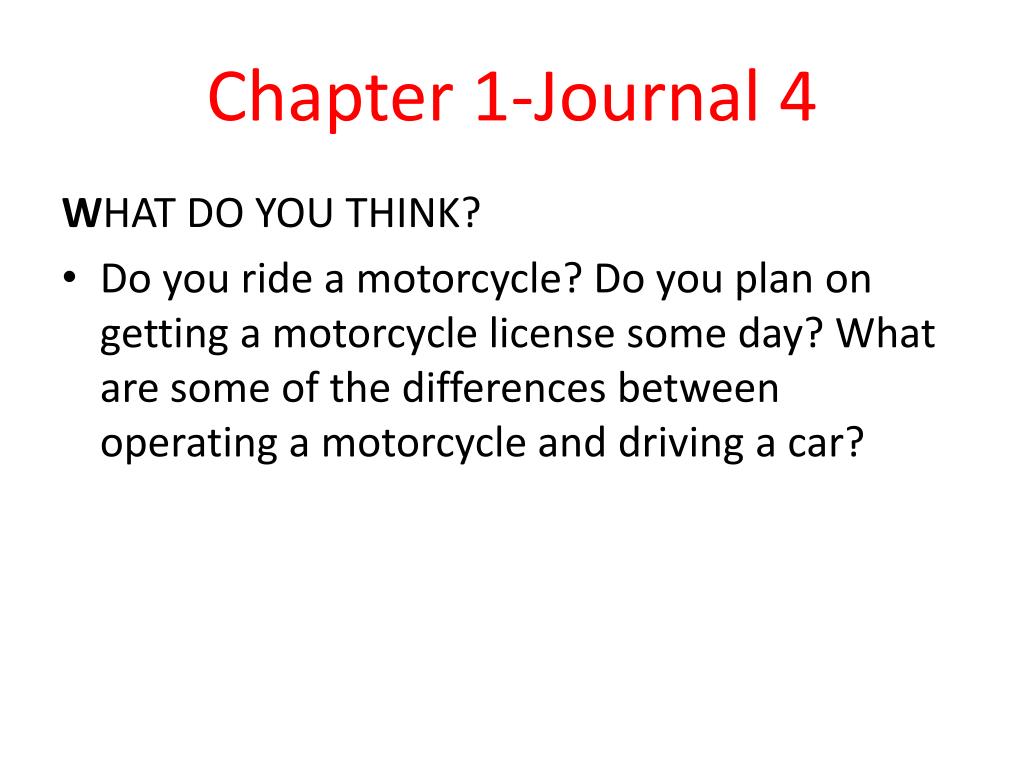 Chapter 1-Journal 4 WHAT DO YOU THINK? • Do you ride a motorcycle? Do you plan on getting a motorcycle license some day? What are some of the differences between operating a motorcycle and driving a car?