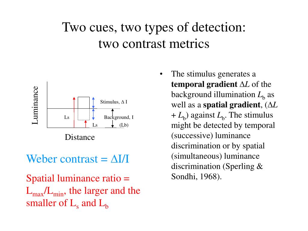 Stimulus, D I Ls Background, I Ls (Lb) Two cues, two types of detection: two contrast metrics • The stimulus generates a temporal gradientDL of the background illumination Lb as well as a spatial gradient, (DL + Lb) against Lb. The stimulus might be detected by temporal (successive) luminance discrimination or by spatial (simultaneous) luminance discrimination (Sperling & Sondhi, 1968). Luminance Distance Weber contrast = DI/I Spatial luminance ratio = Lmax/Lmin, the larger and the smaller of Ls and Lb