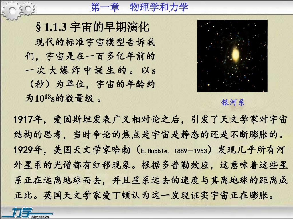 第一章 物理学和力学 §1.1.3 宇宙的早期演化 现代的标准宇宙模型告诉我们,宇宙是在一百多亿年前的一次大爆炸中诞生的。以s(秒)为单位,宇宙的年龄约为1018s的数量级 。 银河系 1917年,爱因斯坦发表广义相对论之后,引发了天文学家对宇宙结构的思考,当时争论的焦点是宇宙是静态的还是不断膨胀的。1929年,美国天文学家哈勃(E.Hubble,1889-1953)发现几乎所有河外星系的光谱都有红移现象。根据多普勒效应,这意味着这些星系正在远离地球而去,并且星系远去的速度与其离地球的距离成正比。英国天文学家爱丁顿认为这一发现证实宇宙正在膨胀。
