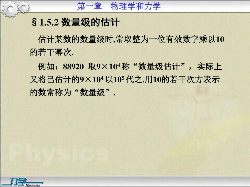 第一章 物理学和力学 §1.5.2 数量级的估计 估计某数的数量级时,常取整为一位有效数字乘以10的若干幂次. 例如:88920 取9×104 称“数量级估计”,实际上又将已估计的9×104 以105 代之.用10的若干次方表示的数常称为“数量级”.