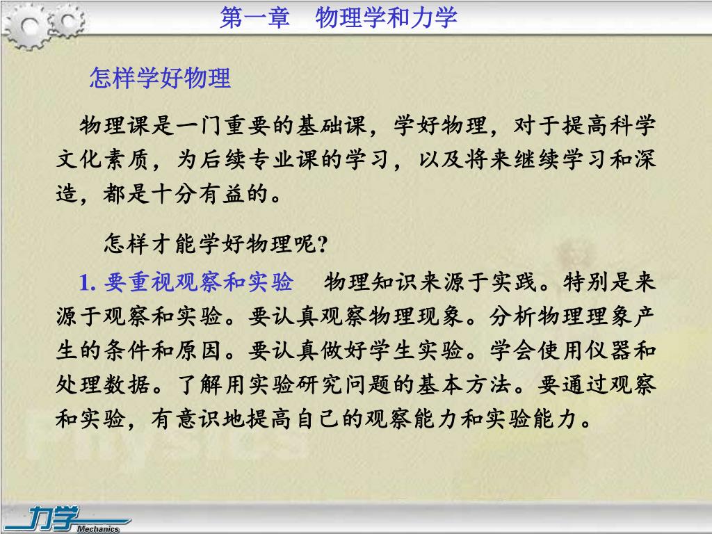 第一章 物理学和力学 运用中学会分析问题的方法。要在不断的运用中,扩展和加深自己的知识,学会对具体问题具体分析。提高分析和解决问题的能力。 4. 要做好练习 做练习是学习物理知识的一个重要环节。是运用知识的一个方面。每做一题,务求真正弄懂,务求有所收获。