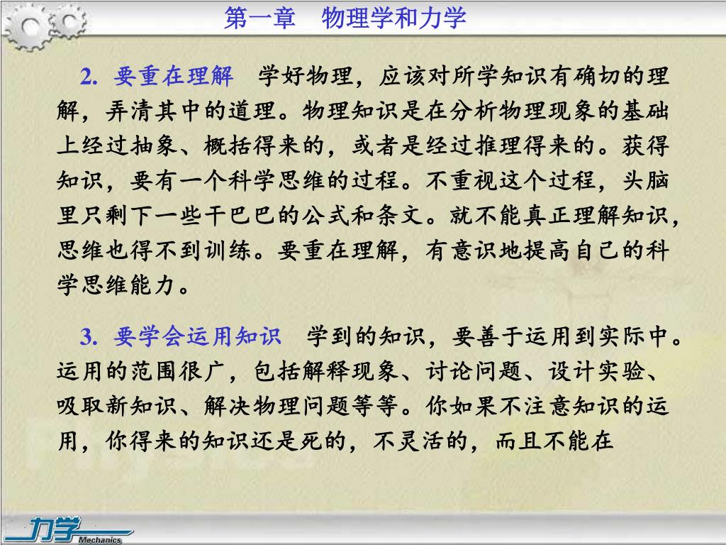 第一章 物理学和力学 2. 要重在理解 学好物理,应该对所学知识有确切的理解,弄清其中的道理。物理知识是在分析物理现象的基础上经过抽象、概括得来的,或者是经过推理得来的。获得知识,要有一个科学思维的过程。不重视这个过程,头脑里只剩下一些干巴巴的公式和条文。就不能真正理解知识,思维也得不到训练。要重在理解,有意识地提高自己的科学思维能力。 3. 要学会运用知识 学到的知识,要善于运用到实际中。运用的范围很广,包括解释现象、讨论问题、设计实验、吸取新知识、解决物理问题等等。你如果不注意知识的运用,你得来的知识还是死的,不灵活的,而且不能在