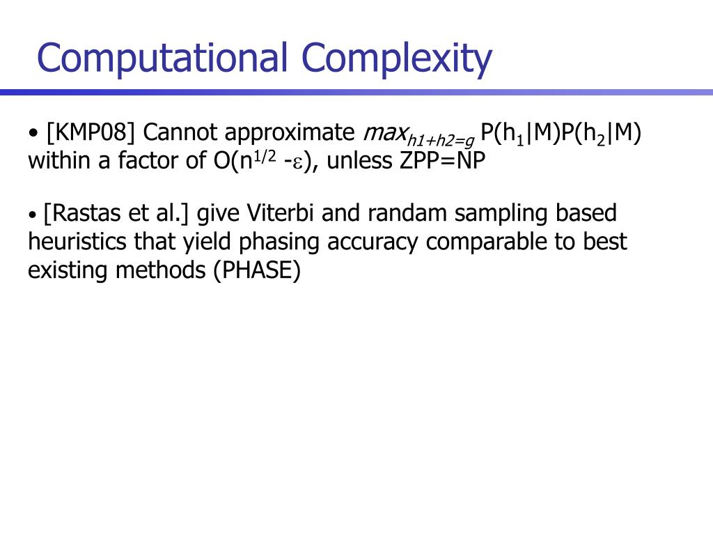 Computational Complexity • [KMP08] Cannot approximate maxh1+h2=gP(h1|M)P(h2|M) within a factor of O(n1/2 -), unless ZPP=NP • [Rastas et al.] give Viterbi and randam sampling based heuristics that yield phasing accuracy comparable to best existing methods (PHASE)