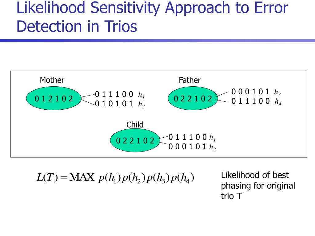 Mother Father 0 1 2 1 0 2 0 2 2 1 0 2 0 0 0 1 0 1 h3 0 1 1 1 0 0 h4 0 1 1 1 0 0 h1 0 1 0 1 0 1 h2 Child 0 2 2 1 0 2 0 1 1 1 0 0 h1 0 0 0 1 0 1 h3 Likelihood of best phasing for original trio T Likelihood Sensitivity Approach to Error Detection in Trios