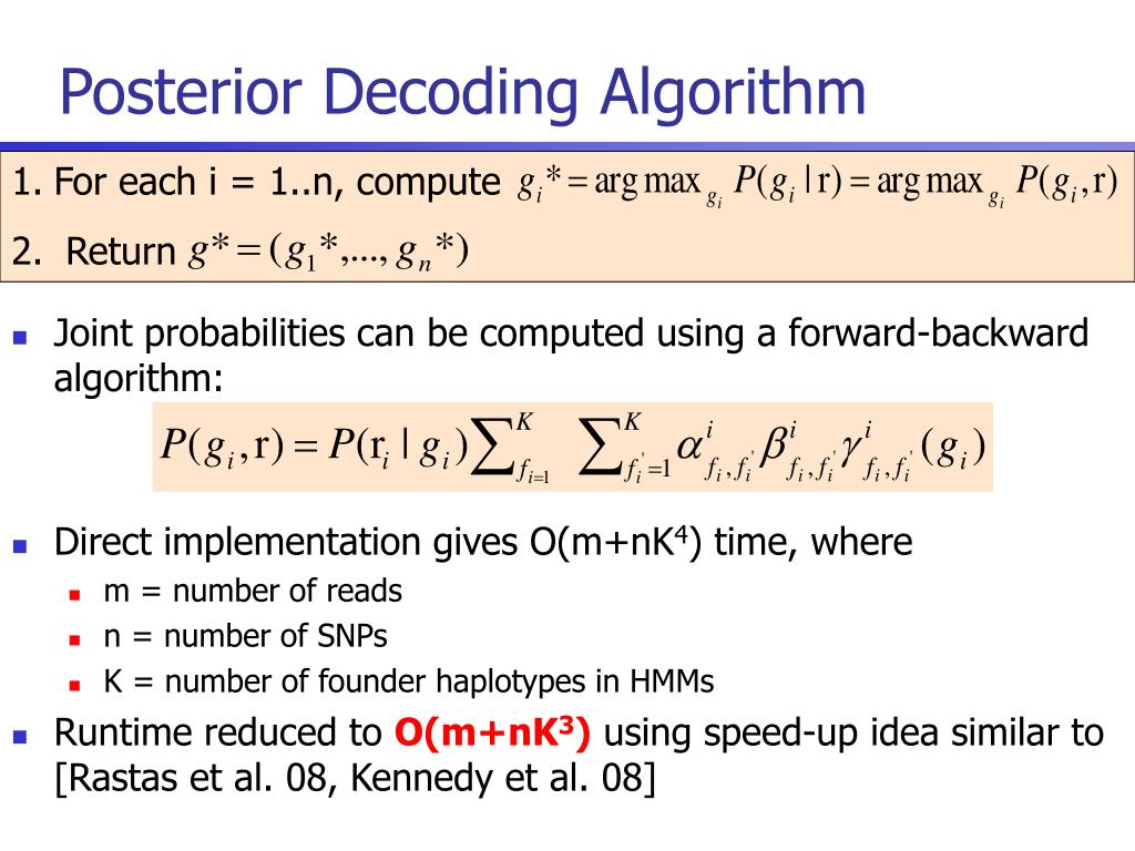 Posterior Decoding Algorithm For each i = 1..n, compute Return • Joint probabilities can be computed using a forward-backward algorithm: • Direct implementation gives O(m+nK4) time, where • m = number of reads • n = number of SNPs • K = number of founder haplotypes in HMMs • Runtime reduced to O(m+nK3) using speed-up idea similar to [Rastas et al. 08, Kennedy et al. 08]