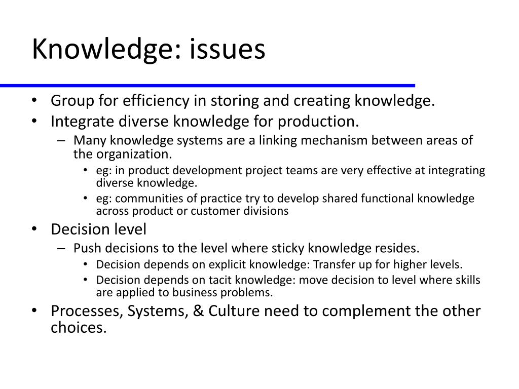 Knowledge: issues • Group for efficiency in storing and creating knowledge. • Integrate diverse knowledge for production. • Many knowledge systems are a linking mechanism between areas of the organization. • eg: in product development project teams are very effective at integrating diverse knowledge. • eg: communities of practice try to develop shared functional knowledge across product or customer divisions • Decision level • Push decisions to the level where sticky knowledge resides. • Decision depends on explicit knowledge: Transfer up for higher levels. • Decision depends on tacit knowledge: move decision to level where skills are applied to business problems. • Processes, Systems, & Culture need to complement the other choices.