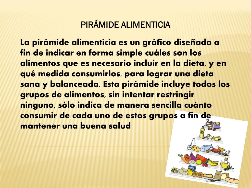 PIRÁMIDE ALIMENTICIA La pirámide alimenticia es un gráfico diseñado a fin de indicar en forma simple cuáles son los alimentos que es necesario incluir en la dieta, y en qué medida consumirlos, para lograr una dieta sana y balanceada. Esta pirámide incluye todos los grupos de alimentos, sin intentar restringir ninguno, sólo indica de manera sencilla cuánto consumir de cada uno de estos grupos a fin de mantener una buena salud