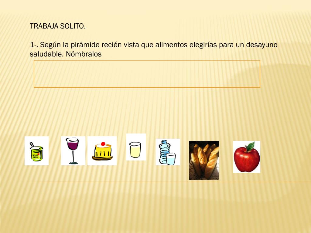 TRABAJA SOLITO. 1-. Según la pirámide recién vista que alimentos elegirías para un desayuno saludable. Nómbralos