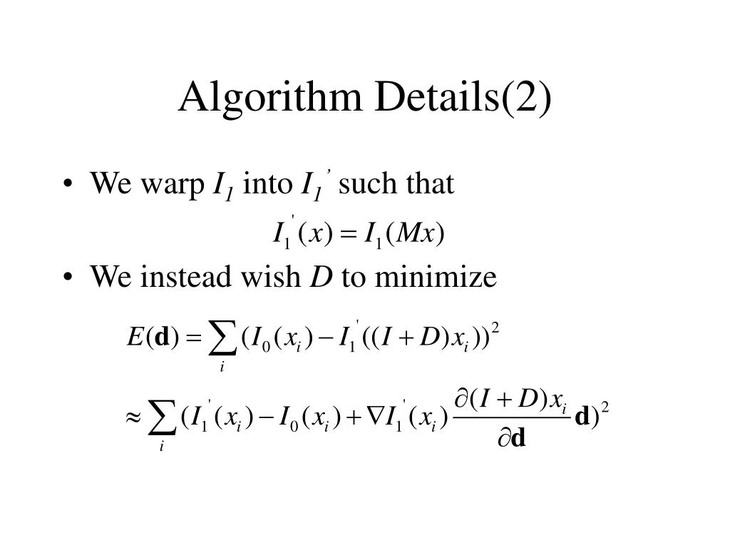 Algorithm Details(1) • Given I0, I1 and current M,we iteratively update M using • We wish D to minimize