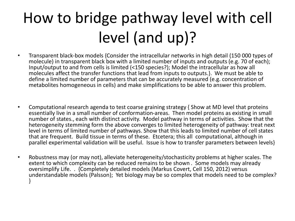 How to bridge pathway level with cell level (and up)? • Transparent black-box models {Consider the intracellular networks in high detail (150 000 types of molecule) in transparent black box with a limited number of inputs and outputs (e.g. 70 of each); Input/output to and from cells is limited (<150 species?); Model the intracellular as how all molecules affect the transfer functions that lead from inputs to outputs.}. We must be able to define a limited number of parameters that can be accurately measured (e.g. concentration of metabolites homogeneous in cells) and make simplifications to be able to answer this problem. • Computational research agenda to test coarse graining strategy { Show at MD level that proteins essentially live in a small number of conformation-areas. Then model proteins as existing in small number of states., each with distinct activity. Model pathway in terms of activities. Show that the heterogeneity stemming form the above converges to limited heterogeneity of pathway: treat next level in terms of limited number of pathways. Show that this leads to limited number of cell states that are frequent. Build tissue in terms of these. Etcetera; this all computational, although in parallel experimental validation will be useful. Issue is how to transfer parameters between levels} • Robustness may (or may not), alleviate heterogeneity/stochasticity problems at higher scales. The extent to which complexity can be reduced remains to be shown . Some models may already oversimplify Life. . {Completely detailed models (Markus Covert, Cell 150, 2012) versus understandable models (Palsson); Yet biology may be so complex that models need to be complex? }