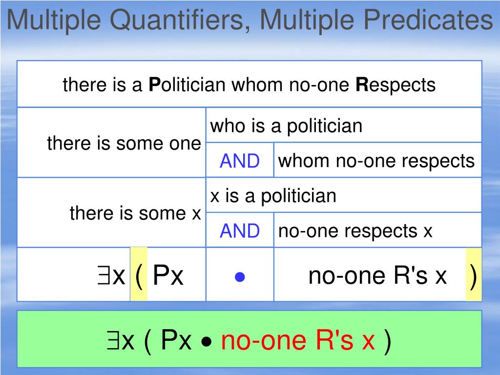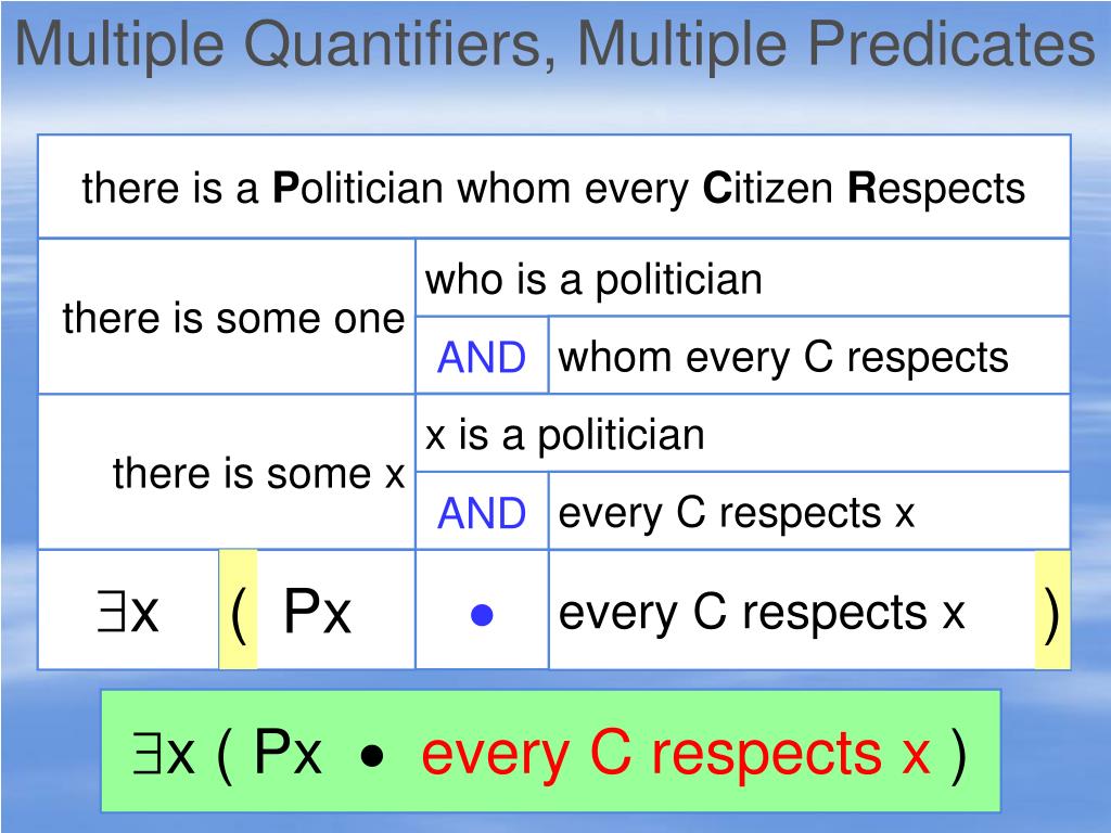 Multiple Quantifiers, Multiple Predicates there is a Citizen who Respects no Politician there is some one who is a citizen AND who respects no P there is some x x is a citizen AND x respects no P x Cx ( x respects no P ) x ( Cxx respects no P )