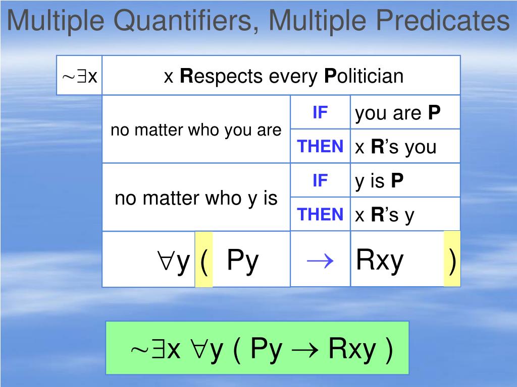 Multiple Quantifiers, Multiple Predicates x x Respects every Politician no matter who you are IF you are P THEN x R’s you no matter who y is IF y is P THEN x R’s y Rxy ) Py y ( x y ( Py Rxy )