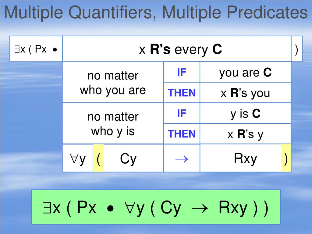 Multiple Quantifiers, Multiple Predicates x ( Px every C R's x ) no matter who you are IF you are C THEN you R x no matter who y is IF y is C THEN y R’s x ( y ) Cy Ryx x (Pxy ( Cy Ryx ) )