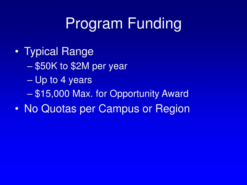 Program Funding • Typical Range • $50K to $2M per year • Up to 4 years • $15,000 Max. for Opportunity Award • No Quotas per Campus or Region