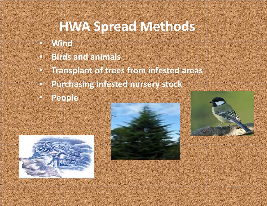 HWA SpreadMethods Wind Birds and animals Transplant of trees from infested areas Purchasing infested nursery stock People