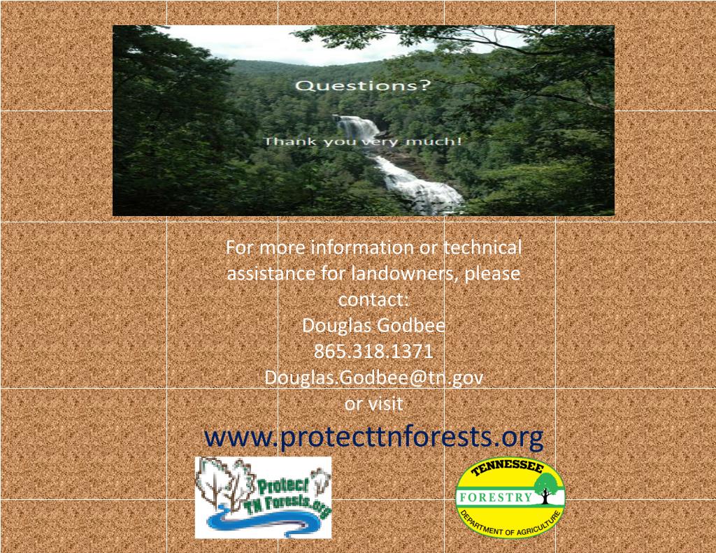For more information or technical assistance for landowners, please contact: Douglas Godbee 865.318.1371 Douglas.Godbee@tn.gov or visit www.protecttnforests.org