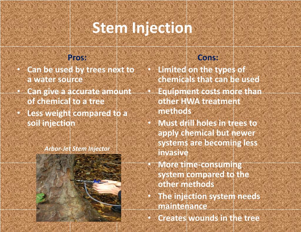 Stem Injection Pros: • Can be used by trees next to a water source • Can give a accurate amount of chemical to a tree • Less weight compared to a soil injection Cons: • Limited on the types of chemicals that can be used • Equipment costs more than other HWA treatment methods • Must drill holes in trees to apply chemical but newer systems are becoming less invasive • More time-consuming system compared to the other methods • The injection system needs maintenance • Creates wounds in the tree Arbor-Jet Stem Injector