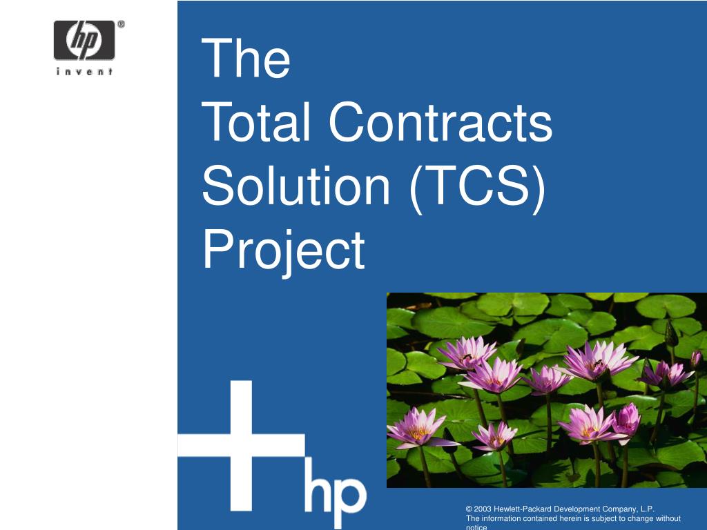 HP - TotalContracts Solution the search and evaluation of the partner/vendors proposed solutions was based on many elements- The quality product that met hp’s requirements - Total quality service and responsiveness- An available ‘off-the-shelf’ product- Fully comprehensive competitive bid- Vendor/Partner good track record- Product functionality upgrading IACCM European Conference 2003
