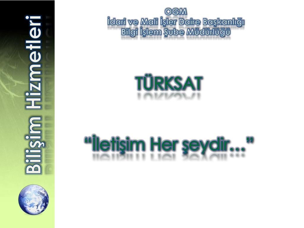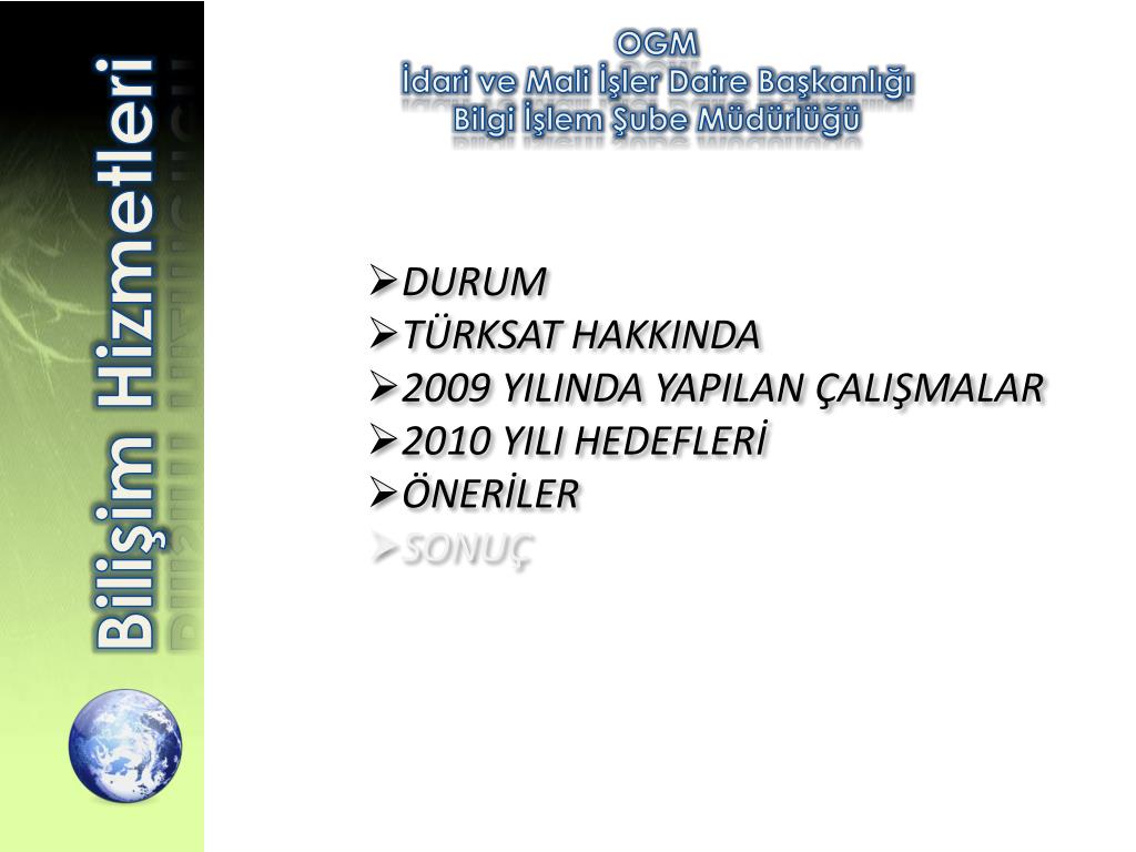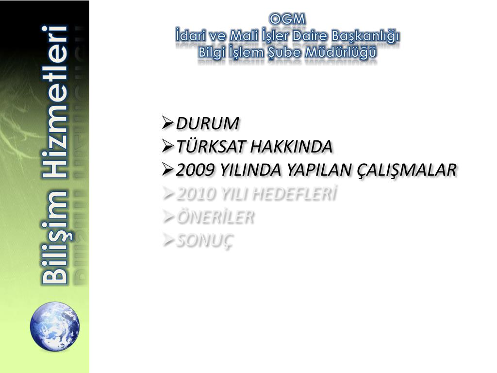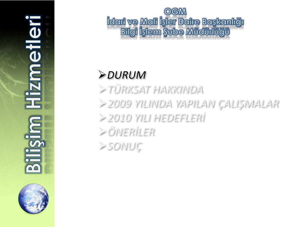 OGM İdari ve Mali İşler Daire Başkanlığı Bilgi İşlem Şube Müdürlüğü • DURUM • TÜRKSAT HAKKINDA • 2009 YILINDA YAPILAN ÇALIŞMALAR • 2010 YILI HEDEFLERİ • ÖNERİLER • SONUÇ Bilişim Hizmetleri