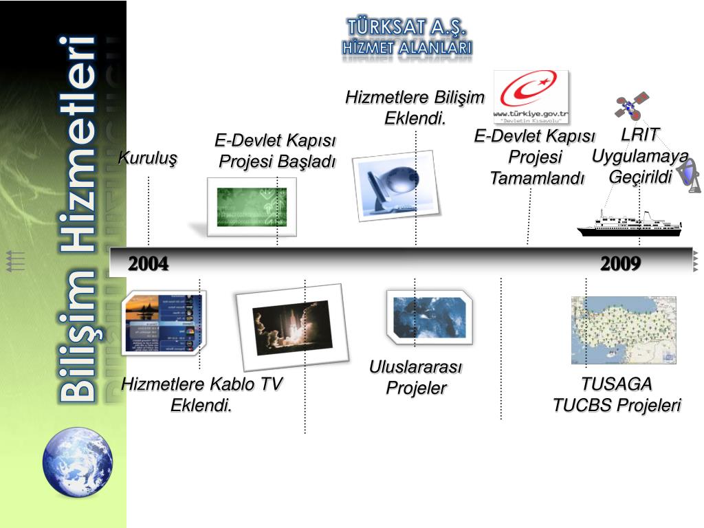 TÜRKSAT A.Ş. HİZMET ALANLARI Hizmetlere Bilişim Eklendi. LRIT Uygulamaya Geçirildi E-Devlet Kapısı Projesi Tamamlandı E-Devlet Kapısı Projesi Başladı Kuruluş Bilişim Hizmetleri 2004 2009 Uluslararası Projeler Hizmetlere Kablo TV Eklendi. TUSAGA TUCBS Projeleri