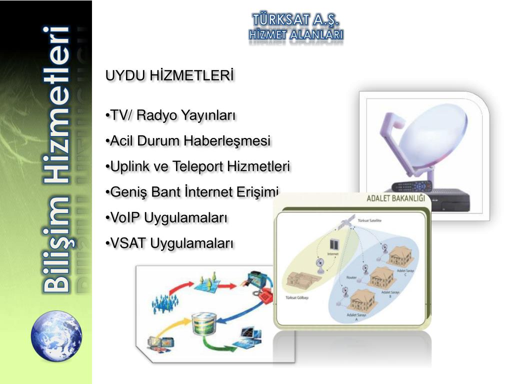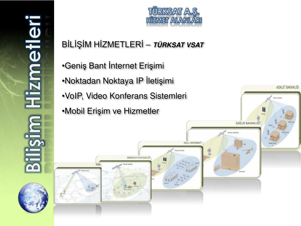 TÜRKSAT A.Ş. HİZMET ALANLARI • BİLİŞİM HİZMETLERİ – TÜRKSAT VSAT • Geniş Bant İnternetErişimi • Noktadan Noktaya IP İletişimi • VoIP, Video Konferans Sistemleri • Mobil Erişim ve Hizmetler Bilişim Hizmetleri