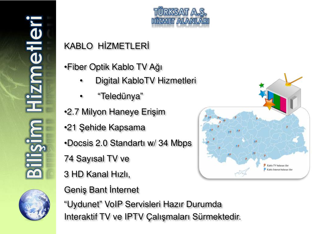 TÜRKSAT A.Ş. HİZMET ALANLARI • KABLO HİZMETLERİ • Fiber Optik Kablo TV Ağı • Digital KabloTV Hizmetleri • “Teledünya” • 2.7 Milyon Haneye Erişim • 21 Şehide Kapsama • Docsis 2.0 Standartıw/ 34 Mbps • 74 Sayısal TV ve • 3 HD Kanal Hızlı, • Geniş Bant İnternet • “Uydunet” VoIP Servisleri Hazır Durumda • Interaktif TV ve IPTV Çalışmaları Sürmektedir. Bilişim Hizmetleri