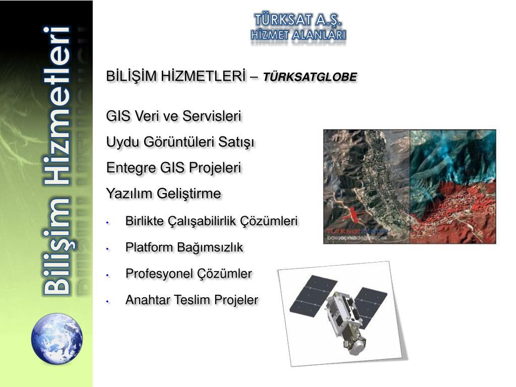 TÜRKSAT A.Ş. HİZMET ALANLARI • BİLİŞİM HİZMETLERİ – TÜRKSATGLOBE • GIS VeriveServisleri • Uydu Görüntüleri Satışı • Entegre GIS Projeleri • Yazılım Geliştirme • Birlikte Çalışabilirlik Çözümleri • Platform Bağımsızlık • Profesyonel Çözümler • Anahtar TeslimProjeler Bilişim Hizmetleri