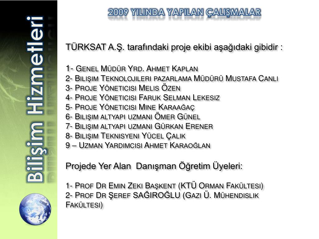 2009 YILINDA YAPILAN ÇALIŞMALAR TÜRKSAT A.Ş. tarafındaki proje ekibi aşağıdaki gibidir : 1- Genel Müdür Yrd. Ahmet Kaplan2- Bilişim Teknolojileri pazarlama Müdürü Mustafa Canlı3- Proje Yöneticisi Melis Özen4- Proje Yöneticisi Faruk Selman Lekesiz5- Proje Yöneticisi Mine Karaağaç6- Bilişim altyapı uzmanı Ömer Günel 7- Bilişim altyapı uzmanı Gürkan Erener 8- Bilişim Teknisyeni Yücel Çalık 9 – Uzman Yardımcısı Ahmet Karaoğlan Projede Yer Alan Danışman Öğretim Üyeleri: 1- Prof Dr Emin Zeki Başkent (KTÜ Orman Fakültesi)2- Prof Dr Şeref SAĞIROĞLU (Gazi Ü. Mühendislik Fakültesi) Bilişim Hizmetleri