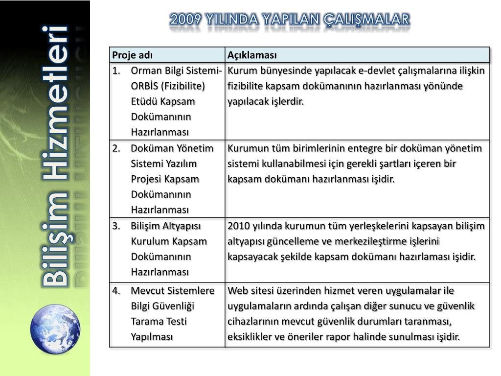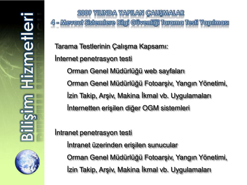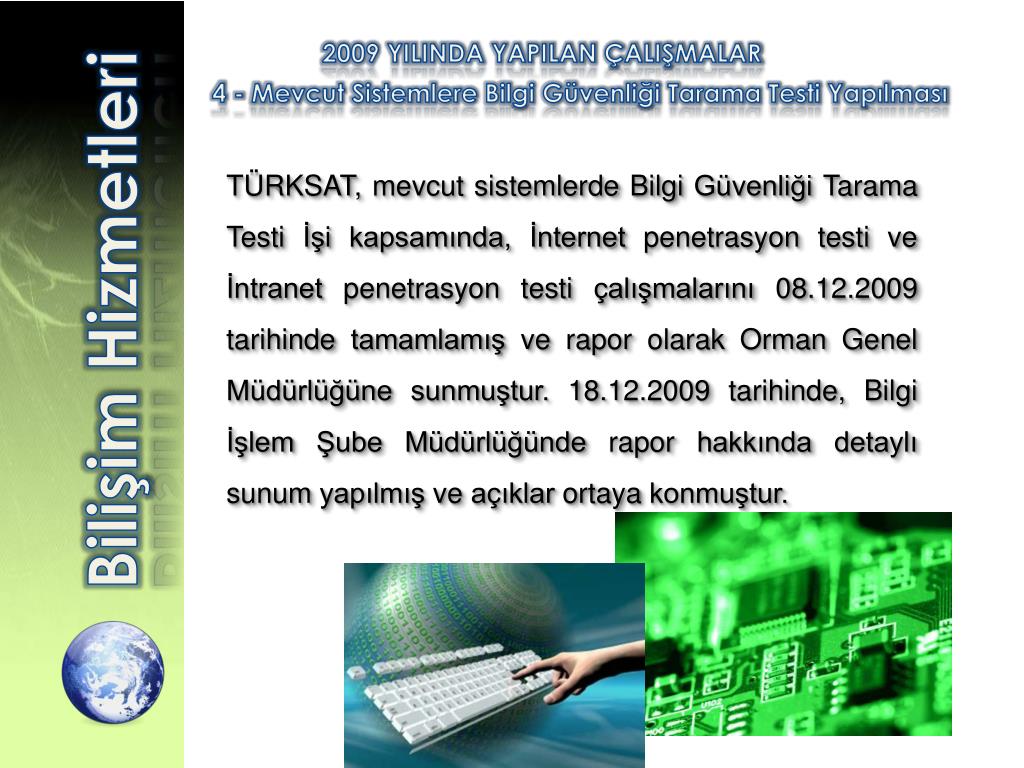 2009 YILINDA YAPILAN ÇALIŞMALAR • 4 - Mevcut Sistemlere Bilgi Güvenliği Tarama Testi Yapılması • TÜRKSAT, mevcut sistemlerde Bilgi Güvenliği Tarama Testi İşi kapsamında, İnternet penetrasyon testi ve İntranet penetrasyon testi çalışmalarını 08.12.2009 tarihinde tamamlamış ve rapor olarak Orman Genel Müdürlüğüne sunmuştur. 18.12.2009 tarihinde, Bilgi İşlem Şube Müdürlüğünde rapor hakkında detaylı sunum yapılmış ve açıklar ortaya konmuştur. Bilişim Hizmetleri