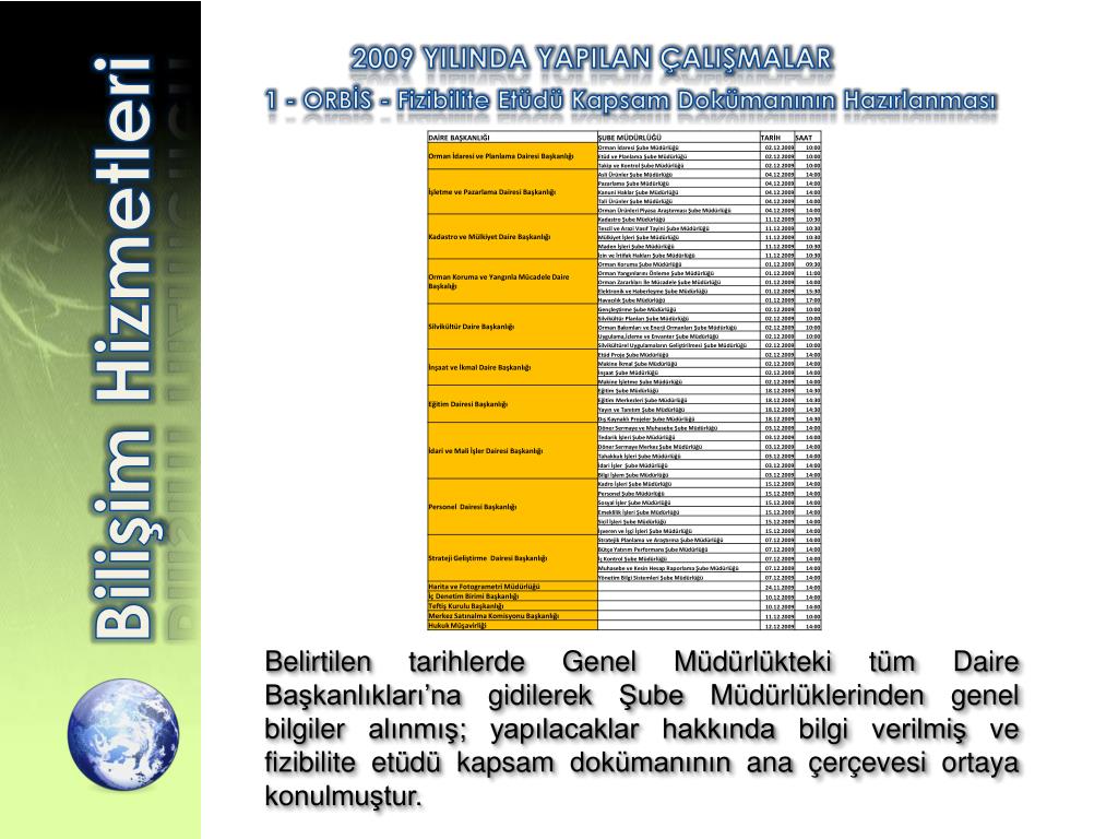 2009 YILINDA YAPILAN ÇALIŞMALAR • 1 - ORBİS - Fizibilite Etüdü Kapsam Dokümanının Hazırlanması Bilişim Hizmetleri Belirtilen tarihlerde Genel Müdürlükteki tüm Daire Başkanlıkları’na gidilerek Şube Müdürlüklerinden genel bilgiler alınmış; yapılacaklar hakkında bilgi verilmiş ve fizibilite etüdü kapsam dokümanının ana çerçevesi ortaya konulmuştur.