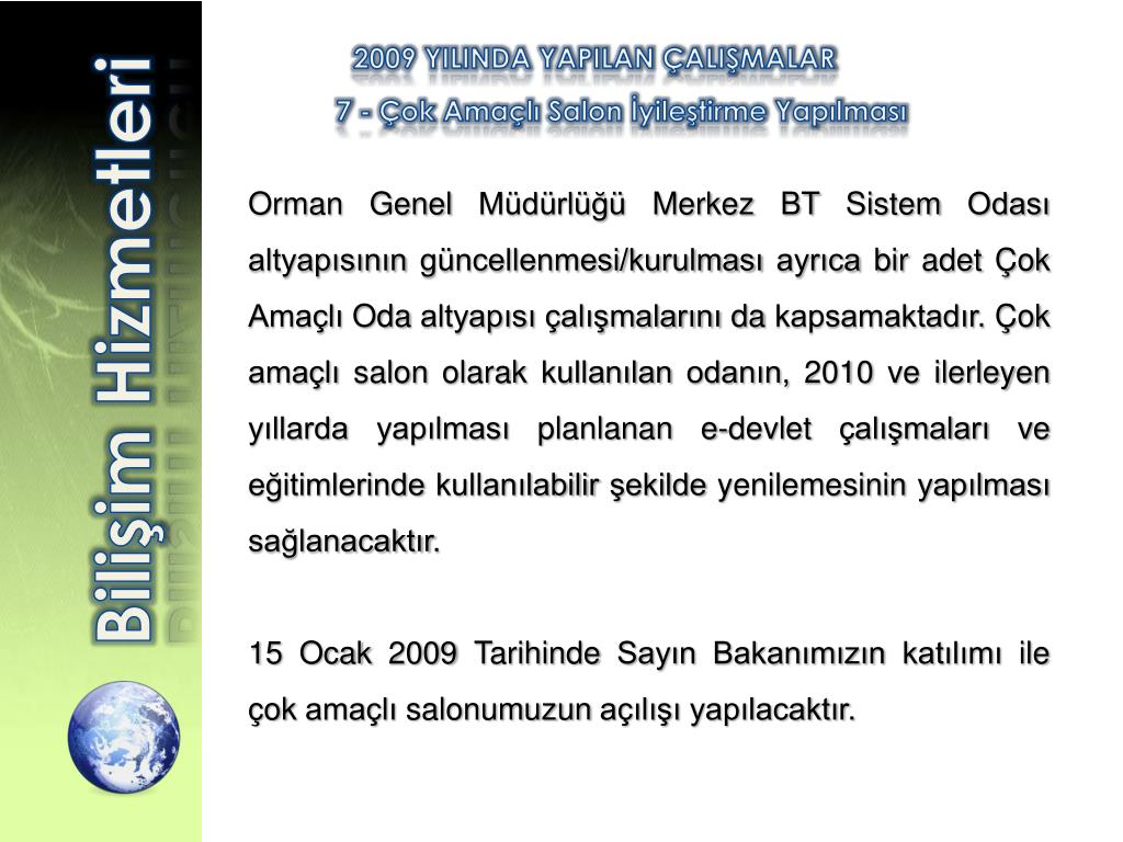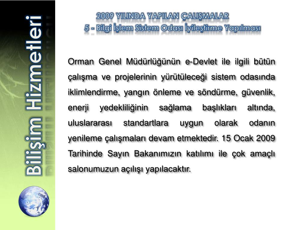 2009 YILINDA YAPILAN ÇALIŞMALAR • 5 - Bilgi İşlem Sistem Odası İyileştirme Yapılması Orman Genel Müdürlüğünün e-Devlet ile ilgili bütün çalışma ve projelerinin yürütüleceği sistem odasında iklimlendirme, yangın önleme ve söndürme, güvenlik, enerji yedekliliğinin sağlama başlıkları altında, uluslararası standartlara uygun olarak odanın yenileme çalışmaları devam etmektedir. 15 Ocak 2009 Tarihinde Sayın Bakanımızın katılımı ile çok amaçlı salonumuzun açılışı yapılacaktır. Bilişim Hizmetleri
