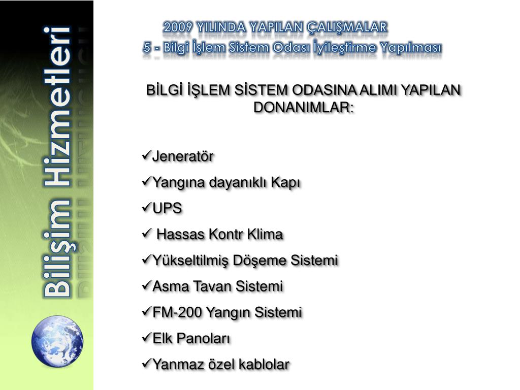 2009 YILINDA YAPILAN ÇALIŞMALAR • 5 - Bilgi İşlem Sistem Odası İyileştirme Yapılması • BİLGİ İŞLEM SİSTEM ODASINA ALIMI YAPILAN DONANIMLAR: • Jeneratör • Yangına dayanıklı Kapı • UPS • Hassas Kontr Klima • Yükseltilmiş Döşeme Sistemi • Asma Tavan Sistemi • FM-200 Yangın Sistemi • Elk Panoları • Yanmaz özel kablolar Bilişim Hizmetleri