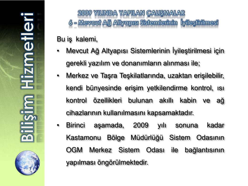2009 YILINDA YAPILAN ÇALIŞMALAR • 6 - Mevcut Ağ Altyapısı Sistemlerinin İyileştirilmesi • Bu iş kalemi, • Mevcut Ağ Altyapısı Sistemlerinin İyileştirilmesi için gerekli yazılım ve donanımların alınması ile; • Merkez ve Taşra Teşkilatlarında, uzaktan erişilebilir, kendi bünyesinde erişim yetkilendirme kontrol, ısı kontrol özellikleri bulunan akıllı kabin ve ağ cihazlarının kullanılmasını kapsamaktadır. • Birinci aşamada, 2009 yılı sonuna kadar Kastamonu Bölge Müdürlüğü Sistem Odasının OGM Merkez Sistem Odası ile bağlantısının yapılması öngörülmektedir. Bilişim Hizmetleri