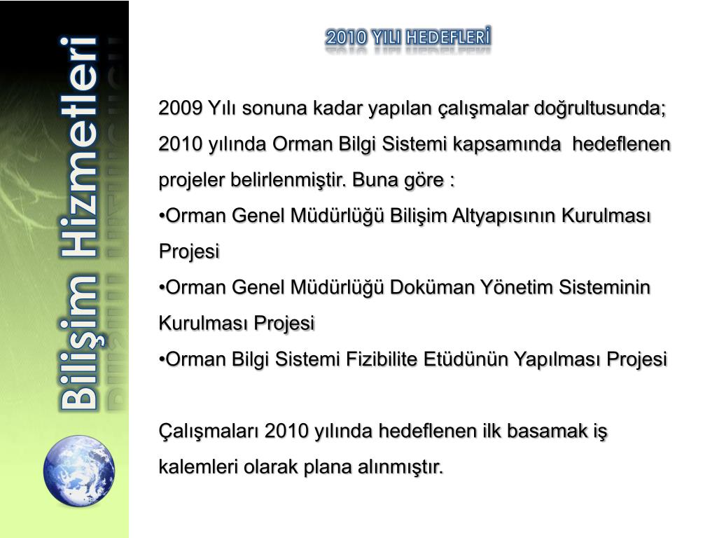 2010 YILI HEDEFLERİ • 2009 Yılı sonuna kadar yapılan çalışmalar doğrultusunda; 2010 yılında Orman Bilgi Sistemi kapsamında hedeflenen projeler belirlenmiştir. Buna göre : • Orman Genel Müdürlüğü Bilişim Altyapısının Kurulması Projesi • Orman Genel Müdürlüğü Doküman Yönetim Sisteminin Kurulması Projesi • Orman Bilgi Sistemi Fizibilite Etüdünün Yapılması Projesi • Çalışmaları 2010 yılında hedeflenen ilk basamak iş kalemleri olarak plana alınmıştır. Bilişim Hizmetleri