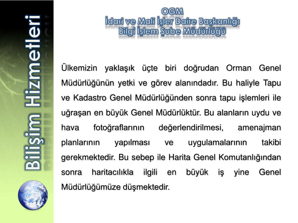 OGM İdari ve Mali İşler Daire Başkanlığı Bilgi İşlem Şube Müdürlüğü Ülkemizin yaklaşık üçte biri doğrudan Orman Genel Müdürlüğünün yetki ve görev alanındadır. Bu haliyle Tapu ve Kadastro Genel Müdürlüğünden sonra tapu işlemleri ile uğraşan en büyük Genel Müdürlüktür. Bu alanların uydu ve hava fotoğraflarının değerlendirilmesi, amenajman planlarının yapılması ve uygulamalarının takibi gerekmektedir. Bu sebep ile Harita Genel Komutanlığından sonra haritacılıkla ilgili en büyük iş yine Genel Müdürlüğümüze düşmektedir. Bilişim Hizmetleri