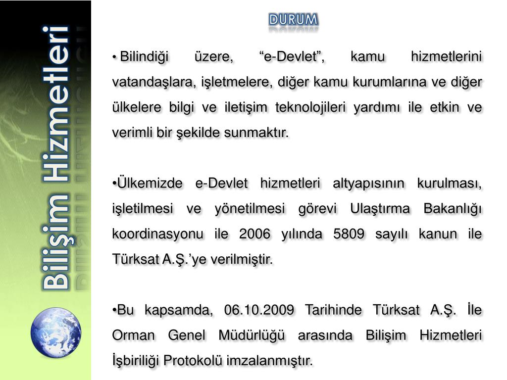 DURUM • Bilindiği üzere, “e-Devlet”, kamu hizmetlerini vatandaşlara, işletmelere, diğer kamu kurumlarına ve diğer ülkelere bilgi ve iletişim teknolojileri yardımı ile etkin ve verimli bir şekilde sunmaktır. • Ülkemizde e-Devlet hizmetleri altyapısının kurulması, işletilmesi ve yönetilmesi görevi Ulaştırma Bakanlığı koordinasyonu ile 2006 yılında 5809 sayılı kanun ile Türksat A.Ş.’ye verilmiştir. • Bu kapsamda, 06.10.2009 Tarihinde Türksat A.Ş. İle Orman Genel Müdürlüğü arasında Bilişim Hizmetleri İşbiriliği Protokolü imzalanmıştır. Bilişim Hizmetleri