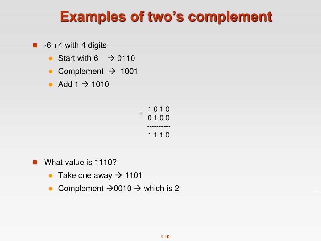 Examples of two’s complement • -6 +4 with 4 digits • Start with 6 0110 • Complement 1001 • Add 1 1010 • What value is 1110? • Take one away 1101 • Complement 0010 which is 2 1 0 1 0 0 1 0 0 ---------- 1 1 1 0 +