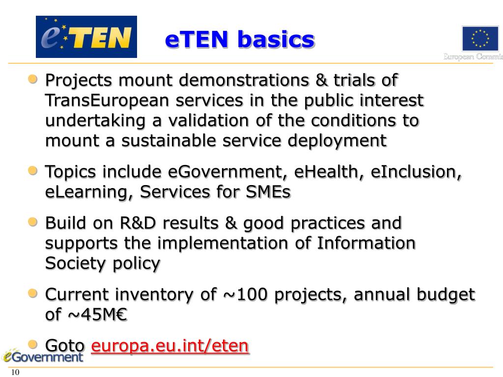 eTEN basics • Projects mount demonstrations & trials of TransEuropean services in the public interest undertaking a validation of the conditions to mount a sustainable service deployment • Topics include eGovernment, eHealth, eInclusion, eLearning, Services for SMEs • Build on R&D results & good practices and supports the implementation of Information Society policy • Current inventory of ~100 projects, annual budget of ~45M€ • Goto europa.eu.int/eten