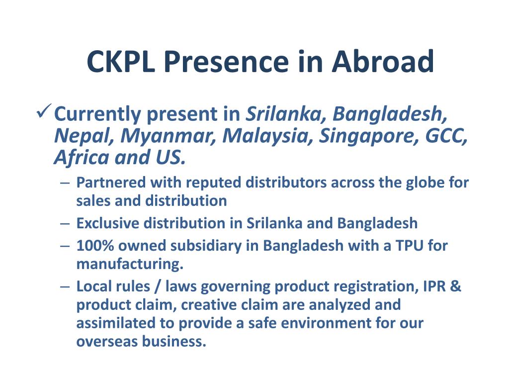CKPL Presence in Abroad • Currently present in Srilanka, Bangladesh, Nepal, Myanmar, Malaysia, Singapore, GCC, Africa and US. • Partnered with reputed distributors across the globe for sales and distribution • Exclusive distribution in Srilanka and Bangladesh • 100% owned subsidiary in Bangladesh with a TPU for manufacturing. • Local rules / laws governing product registration, IPR & product claim, creative claim are analyzed and assimilated to provide a safe environment for our overseas business.