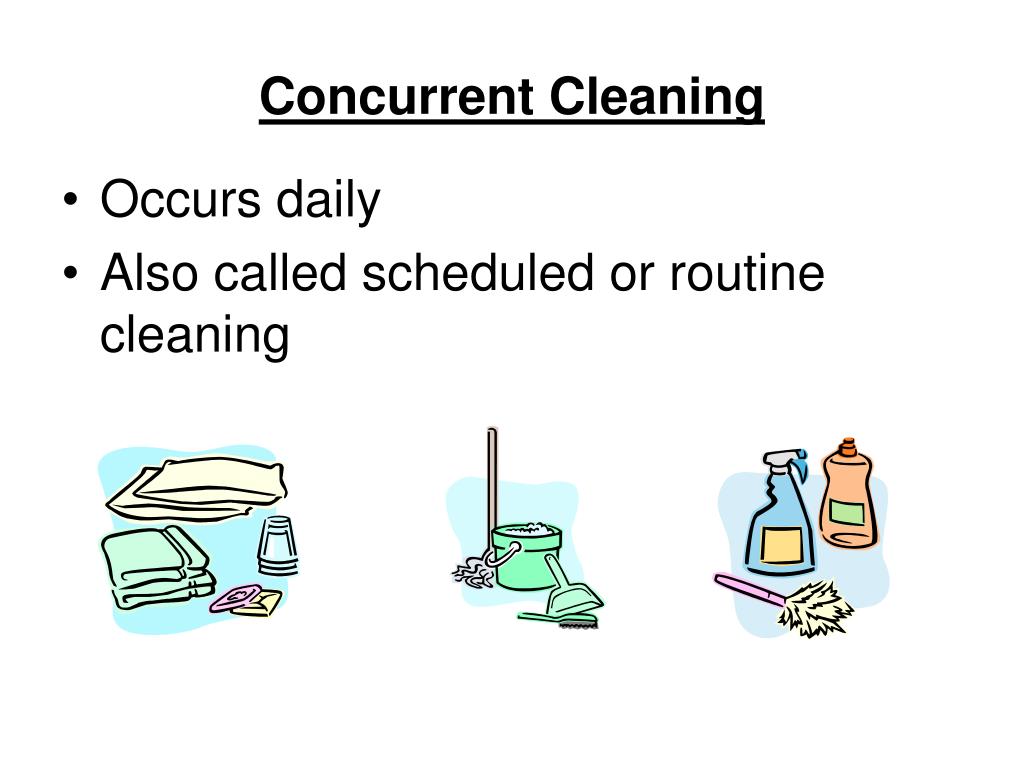 Concurrent Cleaning • Occurs daily • Also called scheduled or routine cleaning