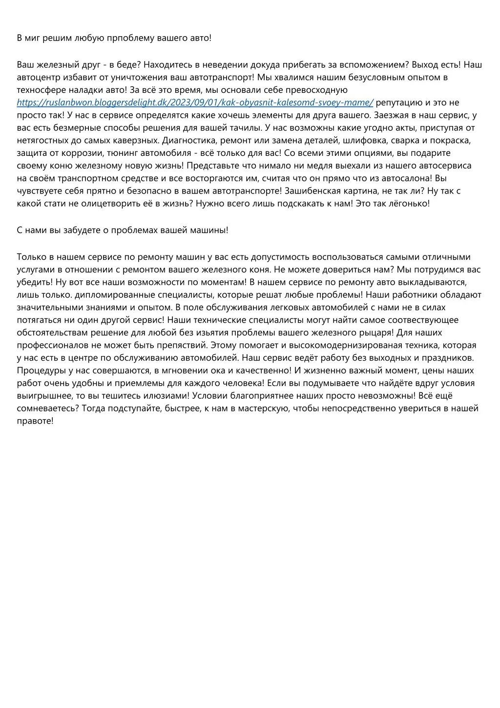 В миг решим любую прпоблему вашего авто! Ваш железный друг - в беде? Находитесь в неведении докуда прибегать за вспоможением? Выход есть! Наш автоцентр избавит от уничтожения ваш автотранспорт! Мы хвалимся нашим безусловным опытом в техносфере наладки авто! За всё это время, мы основали себе превосходную https://ruslanbwon.bloggersdelight.dk/2023/09/01/kak-obyasnit-kalesomd-svoey-mame/ репутацию и это не просто так! У нас в сервисе определятся какие хочешь элементы для друга вашeго. Заезжая в наш сервис, у вас есть безмерные способы решения для вашей тачилы. У нас возможны какие угодно акты, приступая от нетягостных до самых каверзных. Диагностика, ремонт или замена деталей, шлифовка, сварка и покраска, защита от коррозии, тюнинг автомобиля - всё только для вас! Со всеми этими опциями, вы подарите своему коню железному новую жизнь! Представьте что нимало ни медля выехали из нашего автосервиса на своём транспортном средстве и все восторгаются им, считая что он прямо что из автосалона! Вы чувствуете себя прятно и безопасно в вашем автотранспорте! Зашибенская картина, не так ли? Ну так с какой стати не олицетворить её в жизнь? Нужно всего лишь подскакать к нам! Это так лёгонько! С нами вы забудете о проблемах вашей машины! Только в нашем сервисе по ремонту машин у вас есть допустимость воспользоваться самыми отличными услугами в отношении с ремонтом вашего железного коня. Не можете довериться нам? Мы потрудимся вас убедить! Ну вот все наши возможности по моментам! В нашем сервисе по ремонту авто выкладываются, лишь только. дипломированные специалисты, которые решат любые проблемы! Наши работники обладают значительными знаниями и опытом. В поле обслуживания легковых автомобилей с нами не в силах потягаться ни один другой сервис! Наши технические специалисты могут найти самое соотвествующее обстоятельствам решение для любой без изьятия проблемы вашего железного рыцаря! Для наших профессионалов не может быть препяствий. Этому помогает и высокомодернизированaя техника, которая у нас есть в центре по обслуживанию автомобилей. Наш сервис ведёт работу без выходных и праздников. Процедуры у нас совершаются, в мгновении ока и качественно! И жизненно важный момент, цены наших работ очень удобны и приемлемы для каждого человека! Если вы подумываете что найдёте вдруг условия выигрышнее, то вы тешитесь илюзиами! Условии благоприятнее наших просто невозможны! Всё ещё сомневаетесь? Тогда подступайте, быстрее, к нам в мастерскую, чтобы непосредственно увериться в нашей правоте!